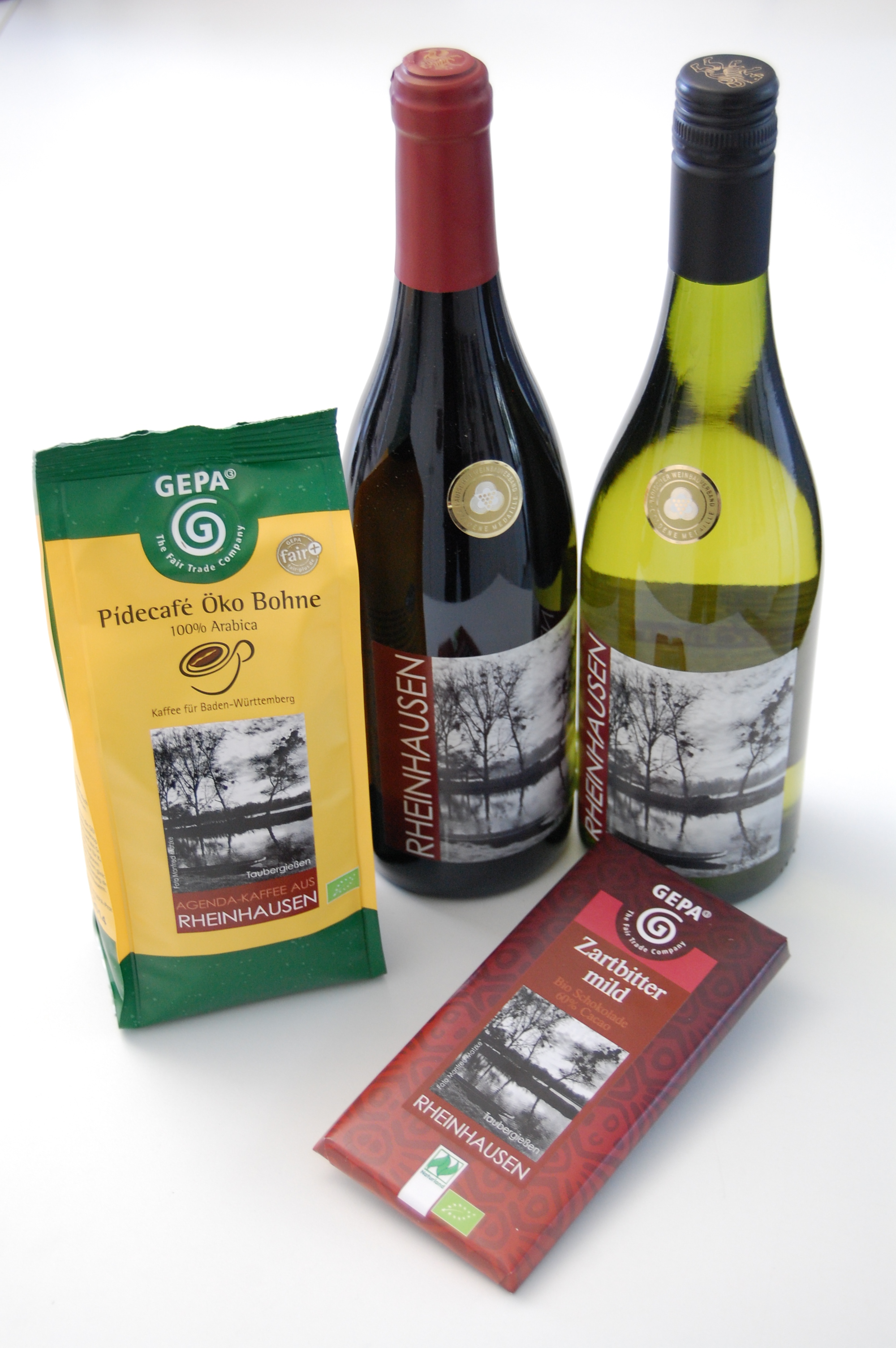 Nicht nur Jubilare freuen sich schon seit einigen Jahren, wenn sie zu Geburtstagen oder Hochzeitsjubiläen einen Wein aus der Gemeinde Rheinhausen erhalten. Auch in der Einwohnerschaft und bei Vereinen sind unsere beiden Weine sehr beliebt, ein Spätburgunder und ein Grauburgunder von der Winzergenossenschaft Sasbach, die Flasche 0,75 Liter zu 6,20 EUR. Neu hinzugekommen sind zwei fair gehandelte Produkte aus dem Weltladen in Herbolzheim, nämlich Kaffee (250 g zu 4,70 EUR) und Zartbitterschokolade (60 % Kakaoanteil, 100 g zu 1,80 EUR).
